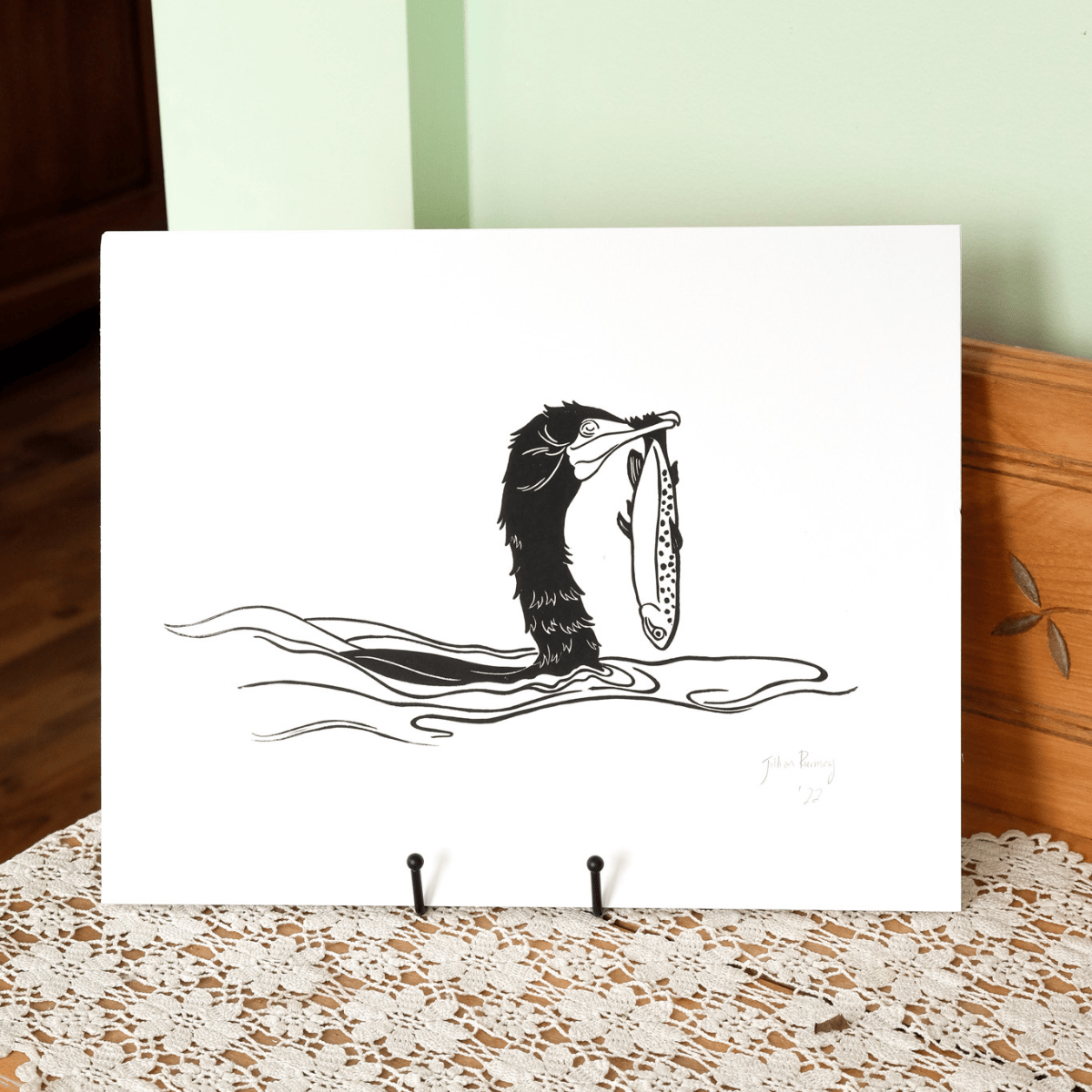 Beautiful handmade print of the sweet and misunderstood Double Crested Cormorant. This ancient treasure of a bird is found across Turtle Island, and is not the villain we we're taught to believe she is. Learn to love her again.